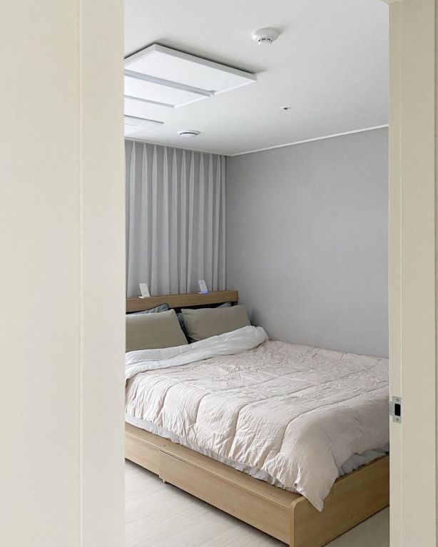 主臥空間適合大人居住,還是喜歡這種簡(jiǎn)單舒適的布局。灰色的墻面搭配灰色的窗簾。木質(zhì)床鋪配上棉質(zhì)床單,看起來非常干凈。難怪別人都說再過10年也是流行。