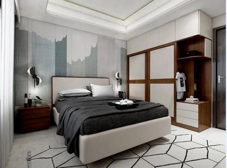若臥室內整體結構較為方正,且墻面無明顯突出的梁柱等障礙,那無論選擇定制家具,還是非定制整裝家具,都能恰當擺放至臥室的某片區域中,這樣我們主要關注下色調風格就可以了。